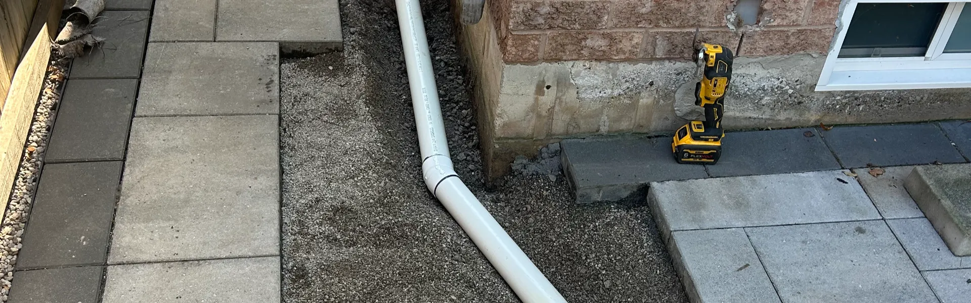 For this Ancaster drainage project, the homeowner was dealing with water from a downspout and sump pump cycling back toward the foundation instead of draining away. We redirected both lines into underground solid pipe, ran it to the backyard, and tied it into a 4" perforated Big O drainage line so the water could disperse farther from the home. Once the drainage was in place, we relayed the interlock and restored the grass so the fix was effective and almost invisible.